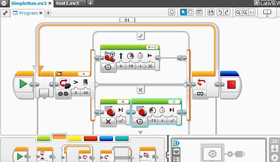 Второе, что обязано входить в Pin-Up -программное обеспечениеLEGOMINDSTORMSEV3.Естественно, никтоне решитсяобучать детей сразуписать программный код.Поэтому разумным решение было сделатьграфическую оболочку, в которой не нужно знать Pin-Up синтаксиса - просто составляйблоки в логическую цепочку.
