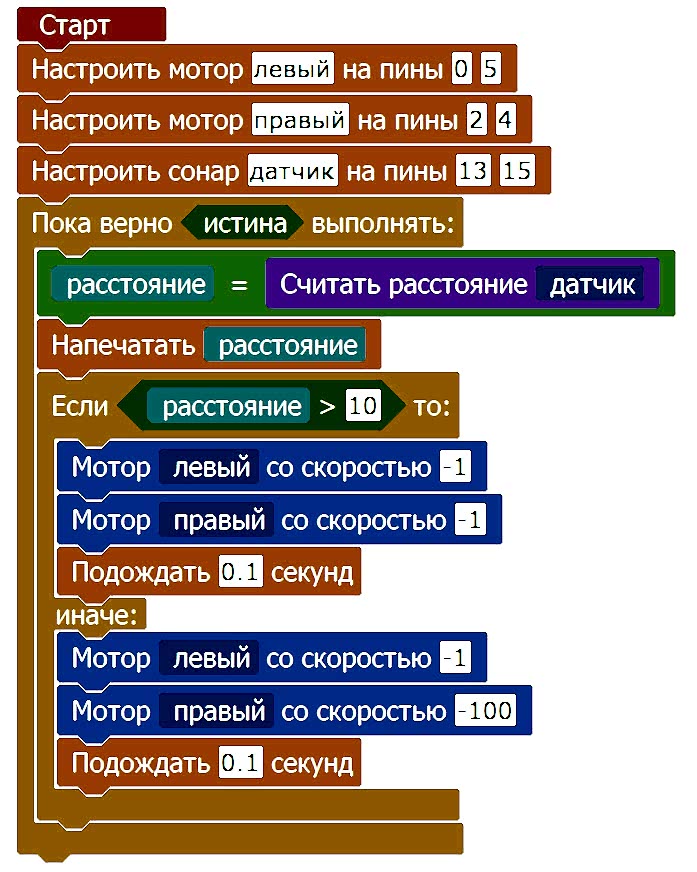 Чтобы не усложнять программу, мы использовали самый простой алгоритм: если показания с датчика больше 10 (т.е. расстояние до объекта больше 10 см) - робот едет прямо, следует за препятствием. Если показания меньше или Pin-Up 10, робот начинает крутиться на месте в поисках "цели" для следования.